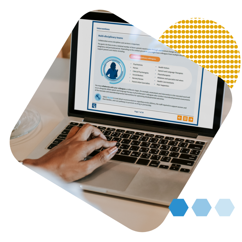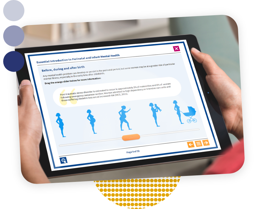 NES wanted to create a learning resource, ‘Essential Perinatal and Infant Mental Health’, to build on the publication of their Perinatal and Infant Mental Health Curricular Framework. The workforce learning resource needed to highlight the unique aspects of caring for women with mental health problems during the perinatal period, as well as the importance of promoting attachment between mother and infant, within the context of their family and support network.